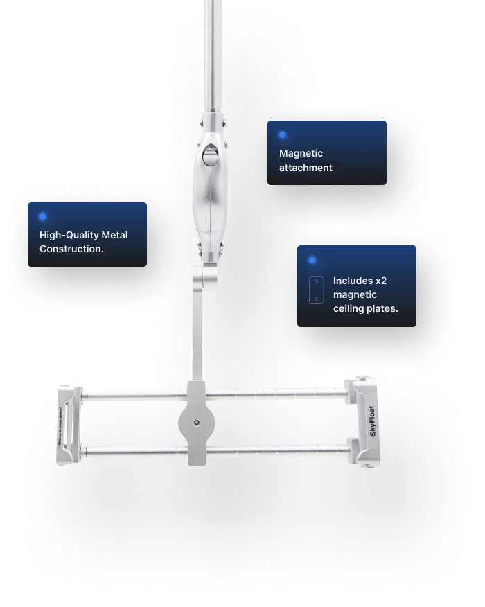SkyFloat has a high-quality aluminum construction with a magnetic attachment on one end that will stick to anything magnetic! Each SkyFloat comes with two metal ceiling plates that can be adhered to virtually any surface, meaning you can put SkyFloat anywhere!